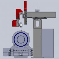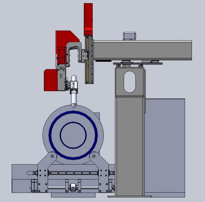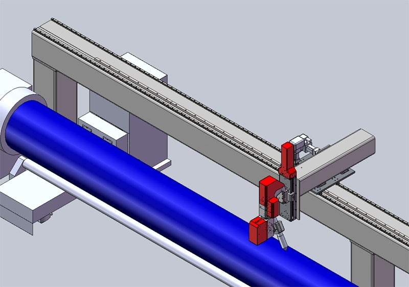 Обрабатываемая труба закрепляется вручную в самоцентрующемся четырехкулачковом патроне шпинделя и всей длиной лежит на двух валиках. Шпиндель управляется бесщеточным приводом, что позволяет согласовывать его вращение с перемещениями по другим осям в соответствии с программой ЧПУ.