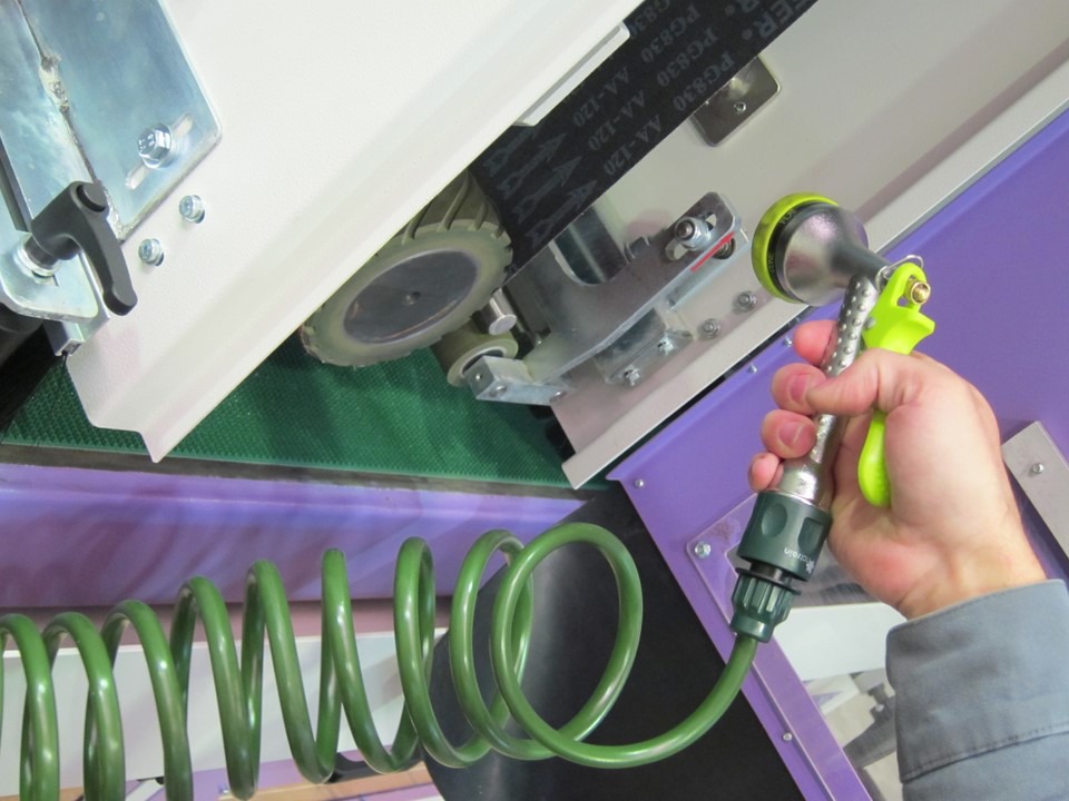 Система мокрой обработки уменьшает нагрев на поверхности обрабатываемого материала, удаляет пыль с поверхности шлифовки. Пыль фильтруется из воды, которая работает в замкнутом контуре.