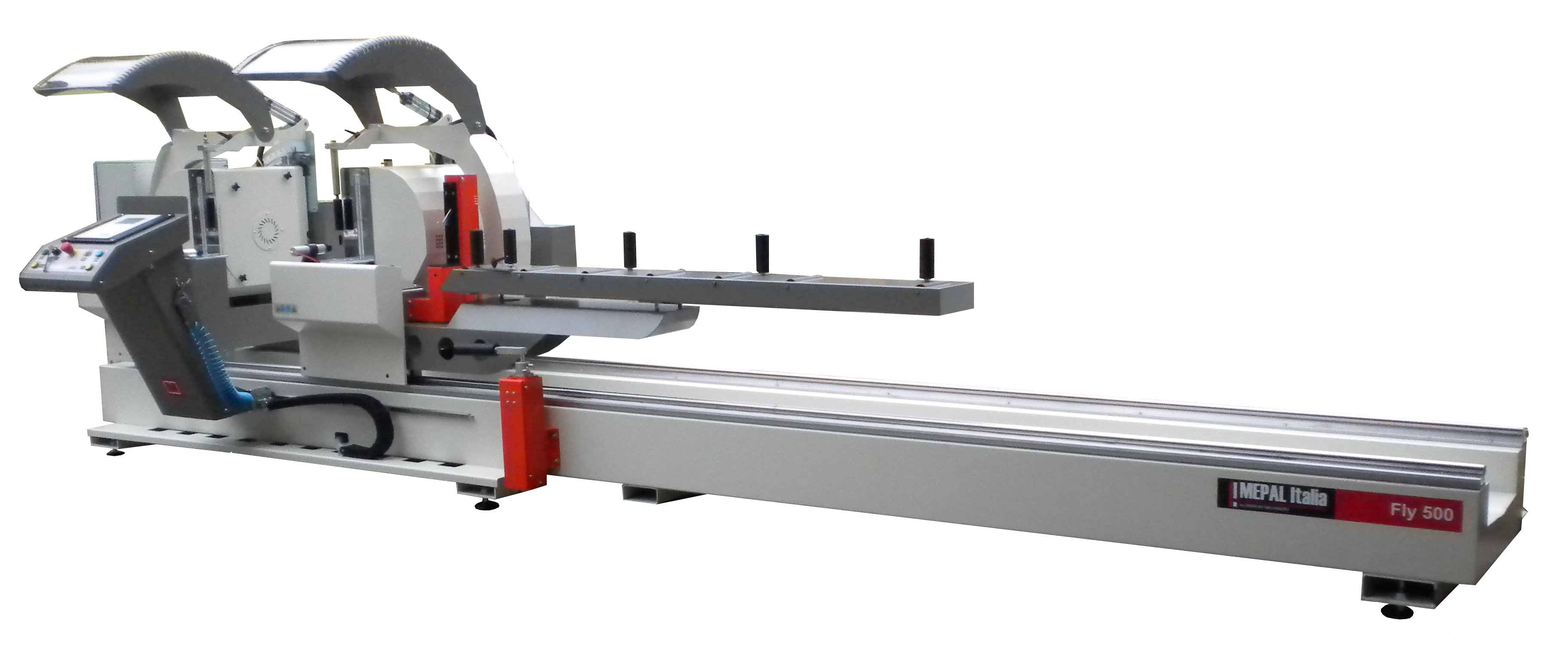 Станок с 2мя отрезными головами с фиксированным блоком на левой стороне и автоматическим движением правой отрезной головы, управляется ЧПУ. Пневматический наклон обоих голов 90°/-45°/ -22.5° для модели FLY 500 с механическими упорами для промежуточных голов реза. Двигатели – 2.2кВт 3х фазные. Станок укомплектовывается горизонтальным и вертикальным зажимами с клапанами низкого давления и защитой зоны резки, 2.5 м подвижной головой конвейера, 2мя дисками Д500мм, и системой впрыска смазки.