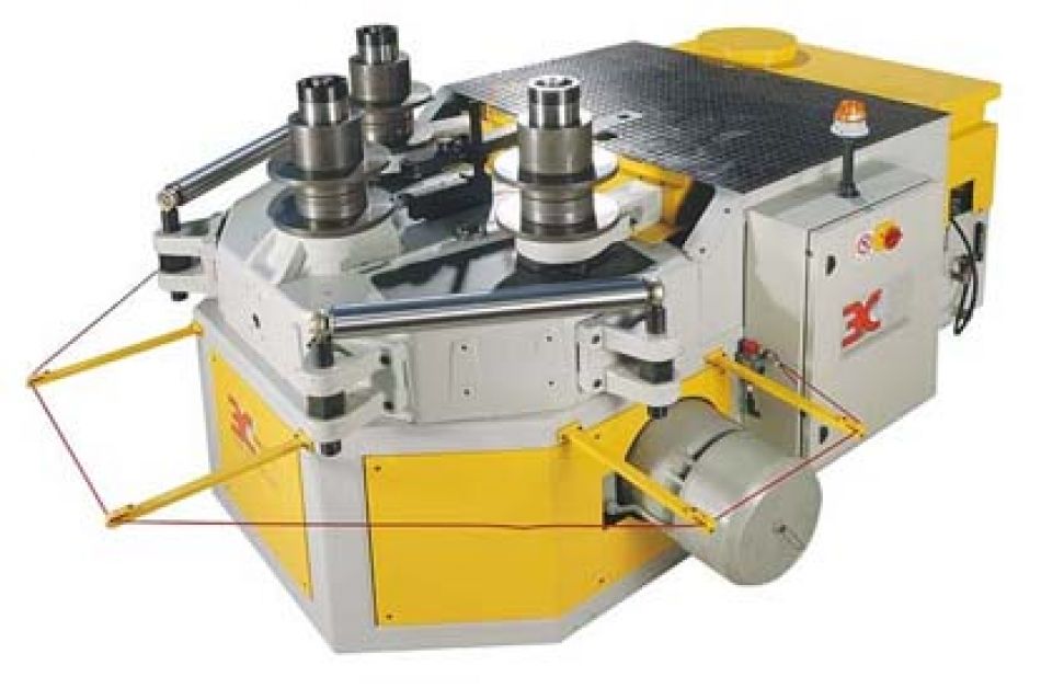 Гидравлический гибочный станок с независимым контролем нижних роликов, управляемый процессором 32 bit, снабженный жидкокристаллическим дисплеем 4х20 и 32-х кнопочным пультом, который позволяет осуществлять моно и многорадусные гибы. Станок осуществляет обработку в однопроходном режиме с 50 шагами программы и 500 скоростями движения нижних валов. Программирование позиционирования гибочных валов с запоминанием и последующей автоматической подсказкой для разных радиусов. Осуществляет, также, один радиус в многопроходном режиме. Как опция, для повторных работ, возможна установка энкодера, который считывает и автоматически распознает положение профиля, а также фотоэлемента для контроля старта цикла. Предусмотрен порт для внешней связи данных между станком и компьютером