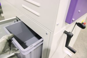 Заусенцы после очистки падают вниз внутри станка и попадают в пластиковый бокс, который легко извлечь из станка для очистки.